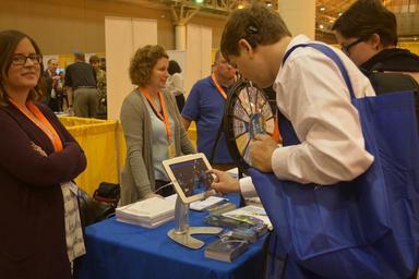 | Keywords: ams2016 goes-r goesr jpss ncei nesdis noaa noaa satellite and information service noaasatelliteandinformationservice noaa satellites noaasatellites education outreach events education and outreach educationandoutreach indoor A WeatherFest participant tries out the GOES-R mobile game "Satellite Insight" at the 2016 AMS WeatherFest. Download "Satellite Insight" from the iTunes store and Google Play! On January 11, the annual AMS WeatherFest was held prior to the start of the 96th Annual Meeting. Open to weather enthusiasts of all ages, this annual weather fair is one of the most popular events at the AMS Annual Meeting. Parents, teachers, kids, youth groups, and others spent the afternoon learning about the weather and participating in fun activities. The NOAA Satellite and Information Service had a booth at the event, staffed by GOES-R, JPSS and NCEI personnel. At the booth, participants could spin the “Wheel of Science” for a chance to answer questions about weather and win prizes. Also available were iPads allowing attendees to experience the GOES-R mobile game “Satellite Insight” and the SARSAT Program’s “Rescue 406.” Original photo source: www.goes-r.gov/multimedia/events.html A WeatherFest participant tries out the GOES-R mobile game "Satellite Insight" at the 2016 AMS WeatherFest. Download "Satellite Insight" from the iTunes store and Google Play! On January 11, the annual AMS WeatherFest was held prior to the start of the 96th Annual Meeting. Open to weather enthusiasts of all ages, this annual weather fair is one of the most popular events at the AMS Annual Meeting. Parents, teachers, kids, youth groups, and others spent the afternoon learning about the weather and participating in fun activities. The NOAA Satellite and Information Service had a booth at the event, staffed by GOES-R, JPSS and NCEI personnel. At the booth, participants could spin the “Wheel of Science” for a chance to answer questions about weather and win prizes. Also available were iPads allowing attendees to experience the GOES-R mobile game “Satellite Insight” and the SARSAT Program’s “Rescue 406.” Original photo source: www.goes-r.gov/multimedia/events.html |