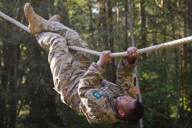 | Keywords: u.s. army usarmy eucom u.s. army europe usarmyeurope usareur nato allies partnership grafenwoehr germany strong europe strongeurope europe best warrior european 21st tsc 21sttsc cbrn 2cr 2nd cavalry regiment 173rd 173 airborne mi 650 650th military intelligence group 7th army training command armytrainingcommand atc 12th 12 cab combat avaiation brigade obstacle course obstaclecourse apft physical fitness test sit ups up push run soldiers chemical biological radioactive nuclear simulation obstacle outdoor U.S. Army Sgt. 1st Class Dominador Rubang, assigned to U.S. Army NATO Brigade, climbs on a rope as part of an obstacle course during the 2016 European Best Warrior Competition held at the 7th Army Training Command's Grafenwoehr Training Area, Germany, Aug. 8, 2016. The intense, grueling annual week-long competition is the most prestigious competitive event of the region. Event organizers will announce the year's top junior officer, noncommissioned officer and Soldier during a concluding ceremony scheduled for Aug. 11 at the Grafenwoehr Physical Fitness Center. (U.S. Army photo by Pfc. Emily Houdershieldt) U.S. Army Sgt. 1st Class Dominador Rubang, assigned to U.S. Army NATO Brigade, climbs on a rope as part of an obstacle course during the 2016 European Best Warrior Competition held at the 7th Army Training Command's Grafenwoehr Training Area, Germany, Aug. 8, 2016. The intense, grueling annual week-long competition is the most prestigious competitive event of the region. Event organizers will announce the year's top junior officer, noncommissioned officer and Soldier during a concluding ceremony scheduled for Aug. 11 at the Grafenwoehr Physical Fitness Center. (U.S. Army photo by Pfc. Emily Houdershieldt) |