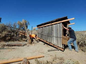 | Keywords: history historic blmcalifornia california blmnevada nevada outdoors archaeology wildlife desert ranch preservation bureau of land management bureauoflandmanagement blmcareers outdoor careers outdoorcareers conservation past public lands publiclands heritage outdoor vehicle railroad -Story and photo by Jen Rovanpera, Archaeologist for the BLM Applegate Field Office The BLM Applegate Field Office just completed stabilizing and preserving a 1930s root cellar on the historic Bitner Ranch located in Washoe County, Nevada. The root cellar was built in the 1930s to store food and other perishables. It consists of a large cavity (cellar) built into the side of a hill just east of the ranch house. Juniper poles were laid across the top of the cavity, the covered with hay from the nearby meadow. Dirt was then piled onto the roof into order to insulate it further. A small wooden structure with steps leads down into the cellar. Once inside, the maximum height of the cellar is about 6 feet. Shelving units were built along three of the walls. Little is known about the beginnings of Bitner Ranch. A structure in Badger Meadows appears on a survey map as early as 1873/1874; however the land was not patented from the state of Nevada until 1900. Based on the style of barbed wire, some of the older corrals and fences were probably built sometime between 1874 and 1892. The ranch hosts a ranch house, a black smith shop with a bunk house for workers, a milk barn, a root cellar, an outhouse, corrals, and a small animal pen. Most of the remaining structures on the property were built in the 1920s, except for the root cellar which was built in the 1930s and the milk barn which might be one of the oldest standing structures on the ranch. The Bureau of Land Management acquired the Bitner Ranch in 1995. Bitner Ranch is an excellent example of a high desert, homestead era ranch and one of the few remaining ranches to be managed by the Bureau of Land Management in northwestern Nevada. The goal is to preserve the historic ranch, continue research, and establish an interpretive center about the history and wildlife of the meadow. The preservation project included removing the dirt that had caved into the cellar through the collapsed roof, stabilizing the wooden structure, and rebuilding the steps into the cellar. The project was completed in two weeks by Jed Mauldin, Dane Mauldin, and Kody Smith of S.T. Rhoades Construction, Inc. Pictured here, once entry way was re-built, the wooden structure was moved back into its original position. -Story and photo by Jen Rovanpera, Archaeologist for the BLM Applegate Field Office The BLM Applegate Field Office just completed stabilizing and preserving a 1930s root cellar on the historic Bitner Ranch located in Washoe County, Nevada. The root cellar was built in the 1930s to store food and other perishables. It consists of a large cavity (cellar) built into the side of a hill just east of the ranch house. Juniper poles were laid across the top of the cavity, the covered with hay from the nearby meadow. Dirt was then piled onto the roof into order to insulate it further. A small wooden structure with steps leads down into the cellar. Once inside, the maximum height of the cellar is about 6 feet. Shelving units were built along three of the walls. Little is known about the beginnings of Bitner Ranch. A structure in Badger Meadows appears on a survey map as early as 1873/1874; however the land was not patented from the state of Nevada until 1900. Based on the style of barbed wire, some of the older corrals and fences were probably built sometime between 1874 and 1892. The ranch hosts a ranch house, a black smith shop with a bunk house for workers, a milk barn, a root cellar, an outhouse, corrals, and a small animal pen. Most of the remaining structures on the property were built in the 1920s, except for the root cellar which was built in the 1930s and the milk barn which might be one of the oldest standing structures on the ranch. The Bureau of Land Management acquired the Bitner Ranch in 1995. Bitner Ranch is an excellent example of a high desert, homestead era ranch and one of the few remaining ranches to be managed by the Bureau of Land Management in northwestern Nevada. The goal is to preserve the historic ranch, continue research, and establish an interpretive center about the history and wildlife of the meadow. The preservation project included removing the dirt that had caved into the cellar through the collapsed roof, stabilizing the wooden structure, and rebuilding the steps into the cellar. The project was completed in two weeks by Jed Mauldin, Dane Mauldin, and Kody Smith of S.T. Rhoades Construction, Inc. Pictured here, once entry way was re-built, the wooden structure was moved back into its original position. |