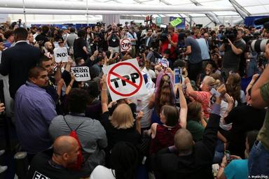 | Keywords: 2016 Democratic Convention protesters at media center.jpg en Protesters staginga silent protest in the 2016 Democratic National Convention's media center located outside of the Wells Fargo Arena where the convention was held 2016-07-26 http //www voanews com/media/photogallery/3439761 html A Shaker/VOA other versions Custom license marker 2016 08 03 VOA Demonstrations and protests at the 2016 Democratic National Convention Images from Voice of America Demonstrations and protests against the TPP 2016 DNC Day 2 Media coverage of the 2016 Democratic National Convention |