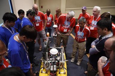 Keywords: 2016 Interanational RoboBoat Competition 160708-N-PO203-129.jpg en 160708-N-PO203-129 VIRGINIA BEACH Va Jul 8 2016 Judges in red question team Pioneer of the Sea from the University of Ulsan South Korea during static judging at the 9th annual AUVSI Foundation and Office of Naval Research-sponsored International RoboBoat competition held in Virginia Beach Virginia Student teams design autonomous robotic boats to navigate and race through an aquatic obstacle course The behaviors demonstrated by these boats mimic tasks that are being developed for coastal surveillance port security and other types of oceanographic operations U S Navy photo by John F Williams/Released <br>Unit Navy Media Content Services 2016-07-08 John Williams https //www dvidshub net/image/2716413/2016-interanational-roboboat-competition 160708-N-PO203-129 2016-07-12 00 07 VIRGINIA BEACH VA US PD-USGov-Military-Navy Office of Naval Research Images from DoD uploaded by Fæ