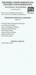 | Keywords: 2016 Spanish General Elections Ballot - Illes Balears - Ciudadanos-Partido de la CiudadanÃa (C’s).png es Papeleta electoral de Ciudadanos-Partido de la CiudadanÃa C ™s para el Congreso - Elecciones Generales de España de 2016 circunscripción de Illes Balears 2016-06-26 own JulianVillodre other versions cc-zero PD-SpanishGov <br/> De minimis The party logo Ballot papers for the 2016 general election for the Balearic Islands All medias supported by Wikimedia España in 2016 Ballot papers for Ciudadanos Uploaded via Campaign bpsge Ballot papers for the 2016 Spain general election supported by Wikimedia España |