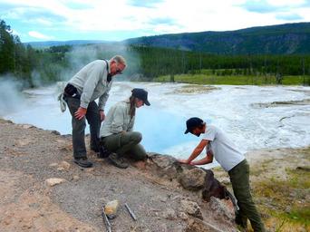 | Keywords: national park service nationalparkservice interns youth programs youthprograms gip geoscientists-in-the-parks geoscientistsintheparks outdoor fieldwork Dave Conway, park volunteer, and GIP interns Megan Norr and Jacob Thacker working on a rock wall that had been undercut by thermal waters at the Artemesia Thermal Feature, Yellowstone National Park, Wyoming. NPS photo Dave Conway, park volunteer, and GIP interns Megan Norr and Jacob Thacker working on a rock wall that had been undercut by thermal waters at the Artemesia Thermal Feature, Yellowstone National Park, Wyoming. NPS photo |