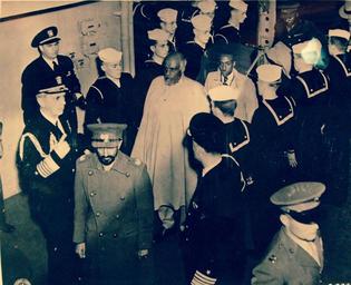 | Keywords: 208-PU-173-F-6: Emperor Haile Selassie of Ethiopia aboard USS Quincy (CA 71) on Great Bitter Lake on the Suez Canal near Cairo. The President was returning from the Crimea Conference, February 13, 1945. He is escorted by Fleet Admiral William D. Leahy, USN. U.S. Army Signal Corps Photograph. Office of War Information Collection. (2016/08/30). 208-PU-173-F-6: Emperor Haile Selassie of Ethiopia aboard USS Quincy (CA 71) on Great Bitter Lake on the Suez Canal near Cairo. The President was returning from the Crimea Conference, February 13, 1945. He is escorted by Fleet Admiral William D. Leahy, USN. U.S. Army Signal Corps Photograph. Office of War Information Collection. (2016/08/30). |