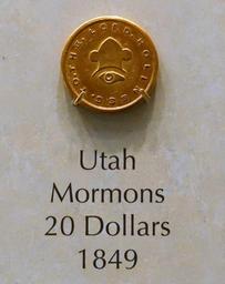 | Keywords: 20 Dollars, Utah Mormons, 1849 - National Museum of American History - DSC00218.jpg en Exhibit in the National Museum of American History Washington DC USA Photography was permitted in the museum without restriction 2015-03-27 11 31 59 own Daderot other versions cc-zero Coins in the National Museum of American History Local currencies of the United States History of Utah | ||||