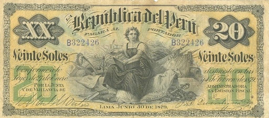 Keywords: 20 soles de 1879.JPG paper money Own 1879 / 2007-05-19 Ernesto Linares Este billete es parte de mi colección privada PD-old-100 Banknotes of Peru Banknotes with a face value of 20 Yellow banknotes