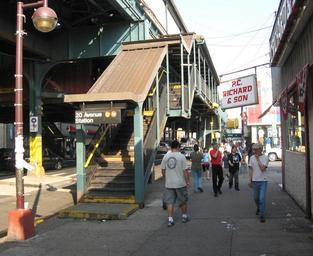 | Keywords: 20th Avenue BMT West End jeh.JPG en Looking east along 86th Street at southwestern stair of 20th Avenue station of the elevated West End Line in Bath Beach on a sunny afternoon ZIP 11214 Own Jim henderson 2008-06-15 40 36 16 6 N 73 59 54 7 W heading ESE 20th Avenue BMT West End Line |