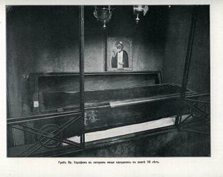 | Keywords: 22. Гроб преподобного Серафима, в котором мощи находились в земле 70 лет.jpg ru Г об п еподобного Се афима в кото ом мощи находились в земле 70 лет 1904 http //andcvet narod ru/arxan/24/sam html не указано other versions Custom license marker 2014 09 24 PD-RusEmpire Uploaded with UploadWizard Album of the Sarov Hermitage views 1904 | ||||