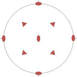 | Keywords: 23 point group.png en Stereographic representation of the symmetry point group 23 The 001 direction is perpendicular to the projection plane The rotation axes are represented in red The thin black ticks show the direction of the equivalent crystallographic axes a and b fr Représentation stéréographique du groupe ponctuel de symétrie 23 La direction 001 est perpendiculaire au plan de projection Les axes de rotation sont représentés en rouge Les trait fins noirs montrent la direction des axes cristallographiques équivalents a et b own Perditax 2011-06-06 Cc-zero Point groups |