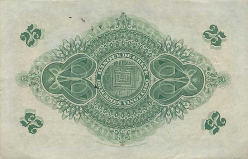 Keywords: 25 drachmas banknote, Cretan State, back view 01.jpg el Πίσω όψη του χαρτονομίσματος των 25 δραχμών της Κρητικής Πολιτείας en 25 drachmas banknote Cretan State back view 1901 1917 http //www greekbanknotes com/greek-banknotes/bank_of_crete/ author other versions Custom license marker 2016 07 02 PD-old PD-1923 Cretan state banknotes |