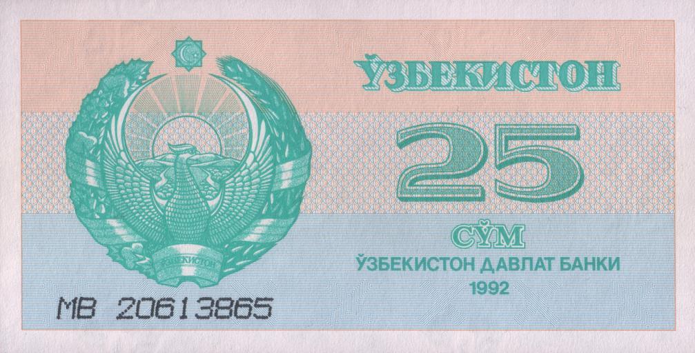 Keywords: 25 som. Uzbekistan, 1992 a.jpg 25 сум Узбекистана 1992 25 sum of Uzbekistan 1992 own scan 1992 Central Bank of the Republic of Uzbekistan Цент альный банк Республики Узбекистан Ўзбекистон Республикаси а казий банки PD-UZ-exempt banknotes Banknotes of Uzbekistan 1992 Banknotes with a face value of 25 Coats of arms of Uzbekistan on banknotes |