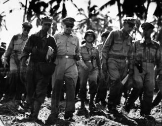 | Keywords: blackandwhite monochrome outdoor black and white 26-G_Box 70_1: Invasion of Leyte, Philippines, 20 October 1944. General Douglas A. MacArthur (wearing glasses) and his staff slog through the sand and muck that only a short time before had been cut up by the footprints of American first waves surging over the beaches of Leyte Island in the Philippines. Calmly ignoring the peril of Japanese snipers, MacArthur landed early in the operation and surveyed the progress of his campaign to liberate the Philippines. U.S. Coast Guard photograph, now in the collections of the National Archives. (2015/12/15). 26-G_Box 70_1: Invasion of Leyte, Philippines, 20 October 1944. General Douglas A. MacArthur (wearing glasses) and his staff slog through the sand and muck that only a short time before had been cut up by the footprints of American first waves surging over the beaches of Leyte Island in the Philippines. Calmly ignoring the peril of Japanese snipers, MacArthur landed early in the operation and surveyed the progress of his campaign to liberate the Philippines. U.S. Coast Guard photograph, now in the collections of the National Archives. (2015/12/15). |