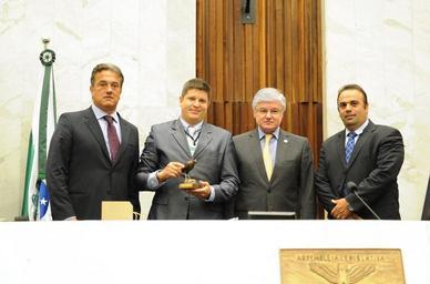 Keywords: 1º secretário, deputado Plauto Miró (DEM); diretor da Onward, Félix Gonzalez; presidente da Assembleia, deputado Valdir Rossoni (PSDB) e 2º secretário, deputado Reni Pereira (PSB). Foto: Sandro Nascimento/Alep (crédito obrigatório)