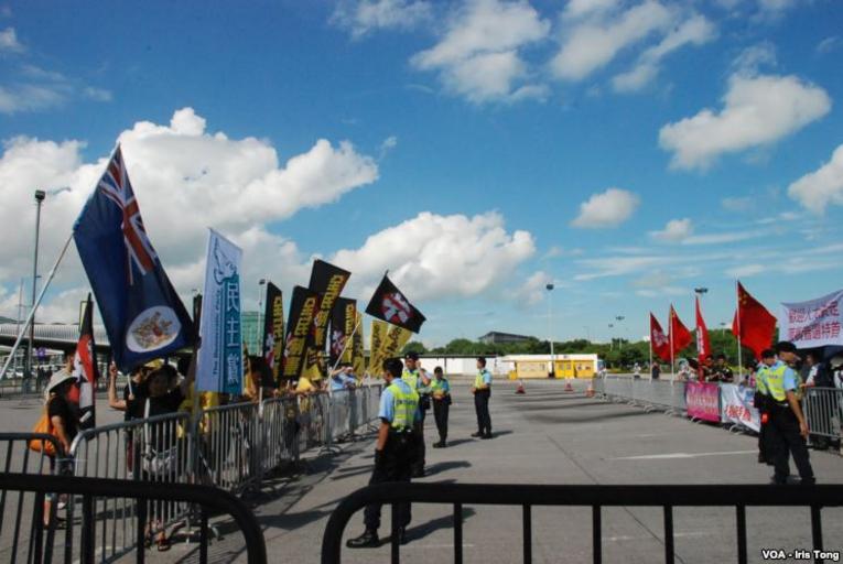 | Keywords: 狙擊李飛 (2).jpg zh-tw 反對及支持中 全 人大常委 對香港特首普選決定的 派及親北京 體, 政改簡介 場外高舉港英旗,以及中 五星旗 香港特 旗 2014-09-02 08 49 55 http //www voacantonese com/media/photogallery/hong-kong-pan-democrats-protest-over-visiting-beijing-officials/2434695 html Voice of America Custom license marker 2014 09 02 PD-USGov-VOA Uploaded with UploadWizard 2014 Hong Kong electoral reform |