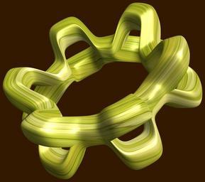| Keywords: mathematica 3d cg parametricplot3d texture torus 輪環 りんかん ドーナツ どーなつ 六芒星 ろくぼうせい 六光星 ろくこうせい 六稜星 ろくりょうせい code program algorithm コード プログラム アルゴリズム geometric sculpture geometricsculpture shape geometry sculpture mapping テクスチャ マッピング 模様 もよう abstract 抽象 ちゅうしょう アブストラクト design pattern デザイン パターン graphic グラフィック グラフィクス structure 意匠 構造 symmetry 対称性 たいしょうせい シンメトリー 対称 たいしょう algorithm コード black background indoor bright a = 6; (* center hole size *) b = 6; (* hexa-torus *) c = -5; (* distance from the center of rotation *) d = 2; (* number of torus *) h = 1; (* height of a torus *) SetOptions[ParametricPlot3D, PlotRange -> Full, Mesh -> None, Boxed -> False, Axes -> False, PlotPoints -> 400, ImageSize -> 3000, Background -> Darker[Orange, 0.8], PlotStyle -> Directive[Specularity[White, 30], Texture[Import["D:/tmp/71.jpg"]]], TextureCoordinateFunction -> ({#4 + #5, #5 / Pi} &), Lighting -> "Neutral"]; f[v_] := Sin[2 Sin[Sin[Sin[v]]]]; x = (a - Cos[t] - f[b s]) Cos[s]; y = (a - Cos[t] - f[b s]) Sin[s]; z = (a - f[t] - h f[b s]) + c; rot = Table[{x, y, z}.RotationMatrix[2 i Pi/d, {1, 1, 0}], {i, d}]; ParametricPlot3D[rot, {t, 0, 2 Pi}, {s, 0, 2 Pi}] (*--- The Texture is this: www.flickr.com/photos/tanaka_juuyoh/5239255695/ *) a = 6; (* center hole size *) b = 6; (* hexa-torus *) c = -5; (* distance from the center of rotation *) d = 2; (* number of torus *) h = 1; (* height of a torus *) SetOptions[ParametricPlot3D, PlotRange -> Full, Mesh -> None, Boxed -> False, Axes -> False, PlotPoints -> 400, ImageSize -> 3000, Background -> Darker[Orange, 0.8], PlotStyle -> Directive[Specularity[White, 30], Texture[Import["D:/tmp/71.jpg"]]], TextureCoordinateFunction -> ({#4 + #5, #5 / Pi} &), Lighting -> "Neutral"]; f[v_] := Sin[2 Sin[Sin[Sin[v]]]]; x = (a - Cos[t] - f[b s]) Cos[s]; y = (a - Cos[t] - f[b s]) Sin[s]; z = (a - f[t] - h f[b s]) + c; rot = Table[{x, y, z}.RotationMatrix[2 i Pi/d, {1, 1, 0}], {i, d}]; ParametricPlot3D[rot, {t, 0, 2 Pi}, {s, 0, 2 Pi}] (*--- The Texture is this: www.flickr.com/photos/tanaka_juuyoh/5239255695/ *) |