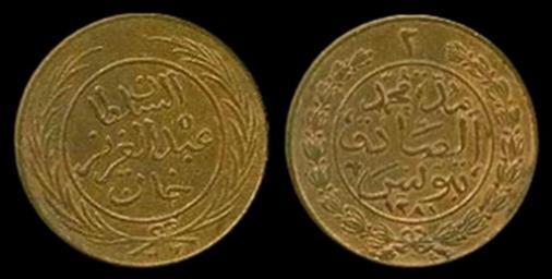 Keywords: 2 Kharub - 1281 H.jpg en 2 Tunisian Kharub coin struck in Tunis in 1281 H 1864 AD during the reign of Muhammad III as-Sadiq Bey own DrFO Jr Tn 2008 Tunisian rial coins