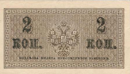 | Keywords: 2 Kopejki back.jpg Разменный знак достоинством 2 копейки об азца 1915 года Российская Импе ия Обо отная сто она Естественные цвета Выпуск Пе вой ми овой войны из-за дефицита монеты когда на од начал п ятать монету се еб яную и медную а азмен на золото был зап ещён с августа 1914 года Russian Empire znak 2 kopejki WWI Version of 1915 year Back Size 45mm x 79 mm scanned note from personal collection 1915 / 2007 original upload date Russian Empire Казначейство / Scanned and processed by NobbiP version 1 and Vizu version 2 PD-RusEmpire PD-old-70 <gallery> image 1 Kopejka front jpg 1 Kopejka Russia front image 1 Kopejka back jpg 1 Kopejka Russia back image 2 Kopejki front jpg 2 Kopejki Russia front </gallery> <references /> Banknotes of the Russian Empire Nicholas II rule Banknotes with a face value of 2 |