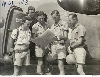 | Keywords: 2 Squadron RAAF Hudson aircrew Hughes NT Mar 1943 AWM NWA0191.jpg AWM caption Australia Northern Territory Hughes Airstrip NT A crew of No 2 Squadron RAAF outside the door of a squadron Lockheed Hudson aircraft examining a map <br> Identified personnel are 405657 Sergeant Sgt Jack Sunner Wireless Air Gunner WAG of Rockhampton Qld 515737 Sgt Keith Hamilton Parker WAG of Perth WA 411524 Sgt later Flight Lieutenant Flt Lt Sidney Leonard McDonald Pilot of Sydney NSW 404946 Sgt later Pilot Officer PO John Loughnan Barnes Observer of Mitchell Qld 411607 Sgt Harold Augustus Roach WAG of Sydney NSW Flt Lt McDonald went missing on April 6 1945 flying with 24 Squadron RAAF when his aircraft was shot down attacking Japanese shipping near Sumba Island Netherlands East Indies He has no known grave and is listed on the Adelaide River Memorial NT PO Barnes was lost on operations near Millingimbi NT on April 20 1943 He is buried in the Adelaide River War Cemetery NT NWA0191 1943-03-11 not stated Copyright expired - public domain PD-Australia No 2 Squadron RAAF World War II people of the Royal Australian Air Force World War II forces of Australia in Australia Lockheed Hudson aircrew Lockheed Hudson in Australian service |