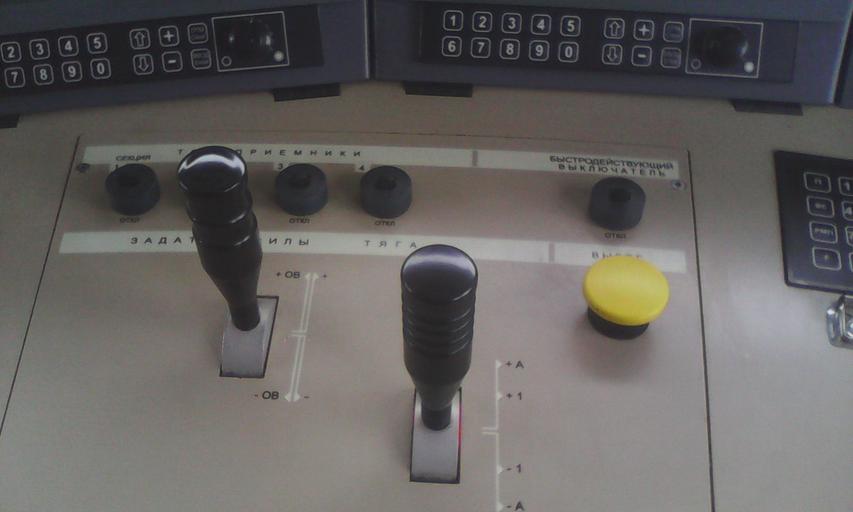 | Keywords: 2ES6-441 s B (5).jpg ru Элект овоз 2ЭС6-441 секция Б Кабина машиниста Пульт уп авления джойстики задатчика силы и тяги уп авление токоп иемниками пульты ввода инфо мации в БЛОК безопасный локомотивный объединённый комплекс и САУТ аходится на абочем месте машиниста 2016-10-20 12 46 15 own Ural-66 other versions cc-zero 2ES6 driver's cabin |