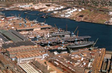 | Keywords: portsmouth va us outdoor 330-CFD-DN-SC-95-01523: Aerial view of the Norfolk Naval Shipyard on the Elizabeth River. Ships in the yard, (L to R), the decommissioned submarine tender Proteus (AS-19), a destroyer under overhaul, the nuclear-powered aircraft carrier USS George Washington (CVN-73), decommissioned submarine tender Hunley (AS-31), the stripped down hull of the decommissioned nuclear-powered guided missile cruiser Virginia (CGN-38) and a medium auxiliary repair dock inside the large graving dock at lower right, 3/25/1995 Robert J. Sitar, USN. (OPA-NARA II-2016/01/06). 330-CFD-DN-SC-95-01523: Aerial view of the Norfolk Naval Shipyard on the Elizabeth River. Ships in the yard, (L to R), the decommissioned submarine tender Proteus (AS-19), a destroyer under overhaul, the nuclear-powered aircraft carrier USS George Washington (CVN-73), decommissioned submarine tender Hunley (AS-31), the stripped down hull of the decommissioned nuclear-powered guided missile cruiser Virginia (CGN-38) and a medium auxiliary repair dock inside the large graving dock at lower right, 3/25/1995 Robert J. Sitar, USN. (OPA-NARA II-2016/01/06). |