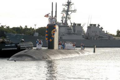 | Keywords: released pearl harbor pearlharbor hawaii (hi) hawaiihi united states of america (usa) unitedstatesofamericausa outdoor 330-CFD-DN-SD-04-10799: Port bow view of the US Navy (USN) Los Angeles Class; Attack Submarine, USS Columbus (SSN 762), showing Sailors on deck as the boat is assisted by a commercial tugboat, while docking at is home port of Pearl Harbor, Hawaii (H1), following a 6-month deployment to the Western Pacific. The USN Arleigh Burke Class (FLIGHT I): Guided Missile Destroyer (AEGIS), USS Russell (DDG 59) is visible in the background, 4/28/2004. PH2 John Looney, USN. (OPA-NARA II-2016/02/06). 330-CFD-DN-SD-04-10799: Port bow view of the US Navy (USN) Los Angeles Class; Attack Submarine, USS Columbus (SSN 762), showing Sailors on deck as the boat is assisted by a commercial tugboat, while docking at is home port of Pearl Harbor, Hawaii (H1), following a 6-month deployment to the Western Pacific. The USN Arleigh Burke Class (FLIGHT I): Guided Missile Destroyer (AEGIS), USS Russell (DDG 59) is visible in the background, 4/28/2004. PH2 John Looney, USN. (OPA-NARA II-2016/02/06). |