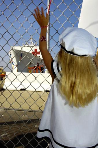 | Keywords: people, family, friends, usns mercy, t-ah 19, msc peoplefamilyfriendsusnsmercytah19msc naval base san diego navalbasesandiego california (ca) californiaca united states of america (usa) unitedstatesofamericausa 330-CFD-DN-SD-07-25995: Four-year old Sarah Wagner waves to her father, U.S. Navy Hospital Corpsman 1ST Class David Wagner, embarked aboard the U.S. Navy Military Sealift Command Mercy Class Hospital Ship USNS MERCY (T-AH 19), from the pier prior to the homecoming ceremony for the crewmembers of the MERCY upon their arrival at their homeport at Naval Base San Diego, Calif., on Sept. 29, 2006. The MERCY, a converted San Clemente Class Super Tanker, is at the end of a five-month humanitarian and civic assistance deployment to Southern and Southeast Asia. (U.S. Navy photo by Mass Communication SPECIALIST 2nd Class Tiffini M. Jones) (Released), 9/29/2006. MC2 Tiffini M. Jones, USN. (OPA-NARA II-2016/02/08). 330-CFD-DN-SD-07-25995: Four-year old Sarah Wagner waves to her father, U.S. Navy Hospital Corpsman 1ST Class David Wagner, embarked aboard the U.S. Navy Military Sealift Command Mercy Class Hospital Ship USNS MERCY (T-AH 19), from the pier prior to the homecoming ceremony for the crewmembers of the MERCY upon their arrival at their homeport at Naval Base San Diego, Calif., on Sept. 29, 2006. The MERCY, a converted San Clemente Class Super Tanker, is at the end of a five-month humanitarian and civic assistance deployment to Southern and Southeast Asia. (U.S. Navy photo by Mass Communication SPECIALIST 2nd Class Tiffini M. Jones) (Released), 9/29/2006. MC2 Tiffini M. Jones, USN. (OPA-NARA II-2016/02/08). |