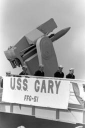| Keywords: long beach naval station longbeachnavalstation california (ca) californiaca united states of america (usa) unitedstatesofamericausa blackandwhite monochrome vehicle aircraft text black and white 330-CFD-DN-SN-85-03334: A view of a Mark 13 guided missile launcher armed with an RIM-24 Tartar surface-to-air missile on the deck of the guided missile frigate USS Gary (FFG 51). The crew is manning the rail during the commissioning ceremony for the Oliver Hazard Perry class ship, 11/17/1984. PH2 Jesus Diaz. (OPA-NARA II-2016/02/22). 330-CFD-DN-SN-85-03334: A view of a Mark 13 guided missile launcher armed with an RIM-24 Tartar surface-to-air missile on the deck of the guided missile frigate USS Gary (FFG 51). The crew is manning the rail during the commissioning ceremony for the Oliver Hazard Perry class ship, 11/17/1984. PH2 Jesus Diaz. (OPA-NARA II-2016/02/22). |