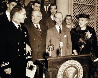| Keywords: groupshot people indoor 330-PS-1283 (USN 708201): Navy Pilot Receives Medal of Honor. President Harry S. Truman and Lieutenant Junior Grade Thomas J. Hudner, Jr., are shown after the awarding the Medal of Honor. Left to right: Lieutenant Junior Grade Thomas J. Hudner, Jr, President Truman, Thomas J. Hudner, Sr. (Father), Mrs. Thomas J. Hudner, Sr, (mother). Rear row: His brothers, Philip, Richard, and his sister Mary. For the attempted rescue of Ensign Brown, whose plane struck by anti-aircraft fire and trailing smoke, was forced down behind enemy lines in the Chosin Reservoir area of Korea on December 4, 1950. Lieutenant Junior Grade Thomas J. Hudner, Jr., USN, received the Medal of Honor from President Harry S. Truman at a ceremony at the White House. Photograph released April 13, 1951. Same as NHHC Photograph NH 97094. (6/16/2015). 330-PS-1283 (USN 708201): Navy Pilot Receives Medal of Honor. President Harry S. Truman and Lieutenant Junior Grade Thomas J. Hudner, Jr., are shown after the awarding the Medal of Honor. Left to right: Lieutenant Junior Grade Thomas J. Hudner, Jr, President Truman, Thomas J. Hudner, Sr. (Father), Mrs. Thomas J. Hudner, Sr, (mother). Rear row: His brothers, Philip, Richard, and his sister Mary. For the attempted rescue of Ensign Brown, whose plane struck by anti-aircraft fire and trailing smoke, was forced down behind enemy lines in the Chosin Reservoir area of Korea on December 4, 1950. Lieutenant Junior Grade Thomas J. Hudner, Jr., USN, received the Medal of Honor from President Harry S. Truman at a ceremony at the White House. Photograph released April 13, 1951. Same as NHHC Photograph NH 97094. (6/16/2015). |
