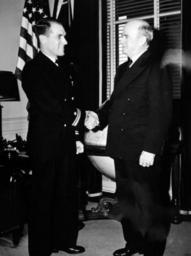 | Keywords: blackandwhite monochrome black and white 330-PS-1283 (USN 708203): Navy Pilot Receives Medal of Honor. In his office at the Pentagon, Secretary of the Navy Francis P. Matthews greets Lieutenant Junior Grade Thomas J. Hudner, Jr. For the attempted rescue of Ensign Brown, whose plane struck by anti-aircraft fire and trailing smoke, was forced down behind enemy lines in the Chosin Reservoir area of Korea on December 4, 1950. Lieutenant Junior Grade Thomas J. Hudner, Jr., USN, received the Medal of Honor from President Harry S. Truman at a ceremony at the White House. Photograph released April 13, 1951. (6/16/2015). 330-PS-1283 (USN 708203): Navy Pilot Receives Medal of Honor. In his office at the Pentagon, Secretary of the Navy Francis P. Matthews greets Lieutenant Junior Grade Thomas J. Hudner, Jr. For the attempted rescue of Ensign Brown, whose plane struck by anti-aircraft fire and trailing smoke, was forced down behind enemy lines in the Chosin Reservoir area of Korea on December 4, 1950. Lieutenant Junior Grade Thomas J. Hudner, Jr., USN, received the Medal of Honor from President Harry S. Truman at a ceremony at the White House. Photograph released April 13, 1951. (6/16/2015). |