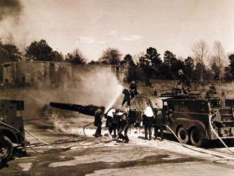 | Keywords: outdoor 330-PS-1341 (USN 706233): The U.S. Navy demonstrates fire-fighting. With the blaze nearly extinguished, the rescue team pull the dummy pilot out of the cockpit of the “crash,” as the other crew members seek to control the remaining fire. Photograph released May 15, 1951. (6/16/2015). 330-PS-1341 (USN 706233): The U.S. Navy demonstrates fire-fighting. With the blaze nearly extinguished, the rescue team pull the dummy pilot out of the cockpit of the “crash,” as the other crew members seek to control the remaining fire. Photograph released May 15, 1951. (6/16/2015). |