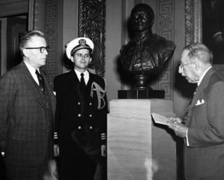 | Keywords: blackandwhite people monochrome indoor black and white 330-PS-2667 (USN 708583): Navy Presents Bust of John Paul Jones to Congress. During a special ceremony in the East Lobby, Gallery Floor of the Senate Wing of the Capitol, Under Secretary of the Navy Francis P. Whitehair, (left), presented the U.S. Naval Academy’s Bust of John Paul Jones to Congress. United States Senator Theodore Francis Green, (right), of Rhode Island, accepted for Congress. Commander James W. McConnaughhay, USN, looks on. The presentation marks the 154th anniversary of the establishment of the Department of the Navy. The bust of the Navy’s first great hero for many years has been a treasured possession of the Naval Academy at Annapolis, Maryland. It was cast in 1904 from an Houdon terra-cotta original, by the late Francis Davis Millet. The original was sent to Major General William Irvine in 1788 by John Paul Jones as a token of friendship. Jones was then in the service of Catherine the Great as a Rear Admiral in the Russian Navy. Jean Antoine Houdon was considered the most important sculptor of French Revolutionary and Napoleonic times. He did several statues of American Revolutionary heroes. Francis Davis Millet was an American artist, war correspondent, and author. He was lost on the Titanic in 1912. Photograph released April 30, 1952. (5/19/2015). 330-PS-2667 (USN 708583): Navy Presents Bust of John Paul Jones to Congress. During a special ceremony in the East Lobby, Gallery Floor of the Senate Wing of the Capitol, Under Secretary of the Navy Francis P. Whitehair, (left), presented the U.S. Naval Academy’s Bust of John Paul Jones to Congress. United States Senator Theodore Francis Green, (right), of Rhode Island, accepted for Congress. Commander James W. McConnaughhay, USN, looks on. The presentation marks the 154th anniversary of the establishment of the Department of the Navy. The bust of the Navy’s first great hero for many years has been a treasured possession of the Naval Academy at Annapolis, Maryland. It was cast in 1904 from an Houdon terra-cotta original, by the late Francis Davis Millet. The original was sent to Major General William Irvine in 1788 by John Paul Jones as a token of friendship. Jones was then in the service of Catherine the Great as a Rear Admiral in the Russian Navy. Jean Antoine Houdon was considered the most important sculptor of French Revolutionary and Napoleonic times. He did several statues of American Revolutionary heroes. Francis Davis Millet was an American artist, war correspondent, and author. He was lost on the Titanic in 1912. Photograph released April 30, 1952. (5/19/2015). |