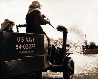 | Keywords: outdoor 330-PS-3012 (USN 708721): New Navy Jeep Fire Engine. Featuring a self-contained fire-extinguishing system capable of delivering 1,300 gallons of fire-killing foam per minute for more than two minutes without refilling, the new jeep fire engine was demonstrated at the Naval Research Laboratory. Designed and built by the Laboratory primarily for use in fighting aircraft fires aboard large aircraft carriers, the new equipment required no other power supply than the 60H.P. jeep engine. Capable of spreading a protective cone of foam 30 feet in diameter, it can reach a crashed plane up to 90 feet away. The raw materials for making the foam are carried in small tanks on the jeep. The system can be put in operation simply by opening two valves and speeding up the jeep engine. Requiring only a two-man team, anyone who can drive a jeep and pull a knob can operate it. Designed to supplement the larger-capacity piped foam system aboard aircraft carriers, the jeep fire engine in simulated crash-fire tests, covering 600 square feet and using 150 gallons of gasoline, “rescues” have been made within 24 seconds after it went into action. Photograph released October 7, 1952. (5/12/2015). 330-PS-3012 (USN 708721): New Navy Jeep Fire Engine. Featuring a self-contained fire-extinguishing system capable of delivering 1,300 gallons of fire-killing foam per minute for more than two minutes without refilling, the new jeep fire engine was demonstrated at the Naval Research Laboratory. Designed and built by the Laboratory primarily for use in fighting aircraft fires aboard large aircraft carriers, the new equipment required no other power supply than the 60H.P. jeep engine. Capable of spreading a protective cone of foam 30 feet in diameter, it can reach a crashed plane up to 90 feet away. The raw materials for making the foam are carried in small tanks on the jeep. The system can be put in operation simply by opening two valves and speeding up the jeep engine. Requiring only a two-man team, anyone who can drive a jeep and pull a knob can operate it. Designed to supplement the larger-capacity piped foam system aboard aircraft carriers, the jeep fire engine in simulated crash-fire tests, covering 600 square feet and using 150 gallons of gasoline, “rescues” have been made within 24 seconds after it went into action. Photograph released October 7, 1952. (5/12/2015). |
