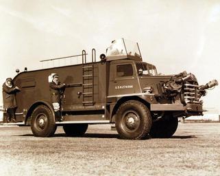| Keywords: vehicle truck car outdoor 330-PS-3097 (USN 708766): New Navy Foam Fire-Fighting Truck. Mounted on a conventional crash truck, a new aircraft crash fire-extinguishing system, developed by the Naval Research Laboratory, under the sponsorship of the Bureau of Aeronautics, produces twice as much foam as previous systems. It can cover a burning airplane with approximately 15,000 gallons of a thick sticky fire-smothering blanket of foam supplied by two pumps on the truck. The improved system is the result of the new designs in nozzles and pumps with two 150-hp engines to power two separate foam-making systems. Air, water, and foam concentrate are whipped together in egg-beater fashion, and the resulting micro-bubbled foam is fleeced out through two distributing nozzles on the front fenders of the truck. These nozzles are pivoted and continuously adjustable by the operator from his position on a “bridge” above and behind the cab of the truck. By pushing a button the operator can widen his foam streams, operating a protective cone of 7,000 gallons of a foam a minute. Tanks hold 1200 gallons of water and 80 gallons of foam concentrate sufficiently for two minutes of continuous, high-capacity operation, November 10, 1952. (5/5/2015). 330-PS-3097 (USN 708766): New Navy Foam Fire-Fighting Truck. Mounted on a conventional crash truck, a new aircraft crash fire-extinguishing system, developed by the Naval Research Laboratory, under the sponsorship of the Bureau of Aeronautics, produces twice as much foam as previous systems. It can cover a burning airplane with approximately 15,000 gallons of a thick sticky fire-smothering blanket of foam supplied by two pumps on the truck. The improved system is the result of the new designs in nozzles and pumps with two 150-hp engines to power two separate foam-making systems. Air, water, and foam concentrate are whipped together in egg-beater fashion, and the resulting micro-bubbled foam is fleeced out through two distributing nozzles on the front fenders of the truck. These nozzles are pivoted and continuously adjustable by the operator from his position on a “bridge” above and behind the cab of the truck. By pushing a button the operator can widen his foam streams, operating a protective cone of 7,000 gallons of a foam a minute. Tanks hold 1200 gallons of water and 80 gallons of foam concentrate sufficiently for two minutes of continuous, high-capacity operation, November 10, 1952. (5/5/2015). |