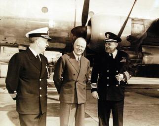 | Keywords: people 330-PS-3249 (USN 708808): During ceremonies at California, Captain R.W.D. Woods, left, Bureau of Aeronautics Representative, accepted the Navy’s first R7V-1 Lockheed “Super Constellation” from Lockheed Aircraft Corporation President Robert K. Gross (center). The 106 passenger plane can be quickly converted to an 18 ton cargo freighter, or a 73 patient ambulance. It has hard facing seats. Called “The Fastest of the Fleet,” the R7V-1 can be used for faster personnel movement, cargo shipment, and hospital plane operations, March 12, 1953. (5/5/2015). 330-PS-3249 (USN 708808): During ceremonies at California, Captain R.W.D. Woods, left, Bureau of Aeronautics Representative, accepted the Navy’s first R7V-1 Lockheed “Super Constellation” from Lockheed Aircraft Corporation President Robert K. Gross (center). The 106 passenger plane can be quickly converted to an 18 ton cargo freighter, or a 73 patient ambulance. It has hard facing seats. Called “The Fastest of the Fleet,” the R7V-1 can be used for faster personnel movement, cargo shipment, and hospital plane operations, March 12, 1953. (5/5/2015). |