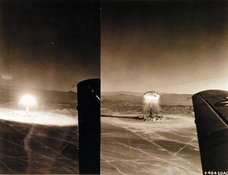 | Keywords: minimalism monochrome 330-PS-3256 (46410 AC): These two aerial views of an atomic explosion were photographed from a U.S. Air Force observer aircraft during one of the continental nuclear tests, conducted over the past two years by the Atomic Energy Commission in the Nevada desert in which Department of Defense participated. U.S. Air Force aircraft not only delivered the weapon to ground zero, but also monitored the whole test area with observer aircraft who perform many duties. These duties include cloud tracking, camera ships, cloud sampling aircraft and other technical aircraft with specific scientific missions. Photograph released March 16, 1953. (5/5/2015). 330-PS-3256 (46410 AC): These two aerial views of an atomic explosion were photographed from a U.S. Air Force observer aircraft during one of the continental nuclear tests, conducted over the past two years by the Atomic Energy Commission in the Nevada desert in which Department of Defense participated. U.S. Air Force aircraft not only delivered the weapon to ground zero, but also monitored the whole test area with observer aircraft who perform many duties. These duties include cloud tracking, camera ships, cloud sampling aircraft and other technical aircraft with specific scientific missions. Photograph released March 16, 1953. (5/5/2015). |