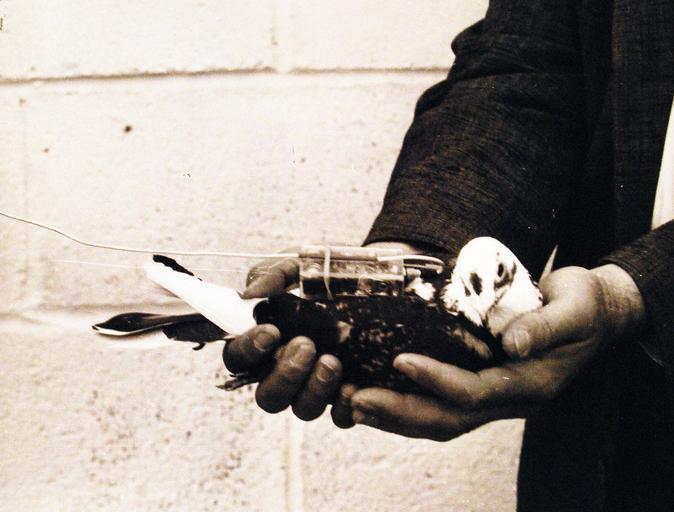 Keywords: 330-PSA-118-61 (USN 710903): Navy Develops System for Tracking Homing Pigeons. A newly developed system which makes it possible for the first time to track a bird through its flight has provided the Navy with a unique research tool. In the first use of the system, a homing pigeon was tracked during a 20-mile flight to its home loft in the Philadelphia area on May 26, 1961. The objective of the study conducted by the Office of Naval Research is to learn how birds, together with aquatic and terrestrial animals, are able to navigate with a high degree of accuracy over long distances frequently in areas previously unknown to them. It is anticipated that this knowledge could lead to new concepts for the development of advanced miniaturized navigation and detection systems. The bird tracking system, developed for the biology branch of the Office of Naval Research by American Electronic Laboratories, Philadelphia, features a powerful miniaturized radio transmitter carried by the bird on its back. Weighing less than one ounce including power supply, the transmitter has an output of one thousandth of a watt (one milliwatt) of power. Supplied by three mercury button cells can operate the unit continuously for a least 20 hours. Attached to the transmitter package (partially shown) is a half wave dipole antenna that trails about 40 inches behind and below the bird. The first eight inches of the antenna is encased in a fiberglass rod to extend it behind the bird and prevent it from interfering with the bird’s tail feathers which provide control. Photograph released June 1, 1961. (9/22/2015). 330-PSA-118-61 (USN 710903): Navy Develops System for Tracking Homing Pigeons. A newly developed system which makes it possible for the first time to track a bird through its flight has provided the Navy with a unique research tool. In the first use of the system, a homing pigeon was tracked during a 20-mile flight to its home loft in the Philadelphia area on May 26, 1961. The objective of the study conducted by the Office of Naval Research is to learn how birds, together with aquatic and terrestrial animals, are able to navigate with a high degree of accuracy over long distances frequently in areas previously unknown to them. It is anticipated that this knowledge could lead to new concepts for the development of advanced miniaturized navigation and detection systems. The bird tracking system, developed for the biology branch of the Office of Naval Research by American Electronic Laboratories, Philadelphia, features a powerful miniaturized radio transmitter carried by the bird on its back. Weighing less than one ounce including power supply, the transmitter has an output of one thousandth of a watt (one milliwatt) of power. Supplied by three mercury button cells can operate the unit continuously for a least 20 hours. Attached to the transmitter package (partially shown) is a half wave dipole antenna that trails about 40 inches behind and below the bird. The first eight inches of the antenna is encased in a fiberglass rod to extend it behind the bird and prevent it from interfering with the bird’s tail feathers which provide control. Photograph released June 1, 1961. (9/22/2015). |