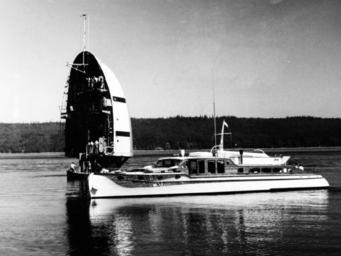 | Keywords: blackandwhite monochrome outdoor black and white 330-PSA-207-62 (USN 1061432): Floating Instrument Platform (FLIP). FLIP in vertical position with the builder’s boat alongside. Photograph released August 7, 1962. Master caption: A new type of oceanographic research vessel – Floating Instrument Platform (FLIP) – is undergoing operational tests by the U.S. Navy in Dabob Bay, near Seattle, Washington. FLIP has been constructed for the Marine Physical Laboratory of Scrupps Institution of Oceanography under contract to the Office of Naval Research. The craft can literally flip from a horizontal to a vertical position while at sea. FLIP is flipped into the vertical position by flooding its long aft section with sea water. Only its “four story” bow section remains above the water. To return the vessel to a horizontal position, high pressure air blows the water out of the submerged section. FLIP will be used for studies of wave motion, marine biology, internal waves, sound waves, and other phenomena. The vessel has accommodation for four people and can carry enough supplies to last for about two weeks. In the vertical position, the research laboratories, living quarters, and engine room are above the water. Two diesel engines supply electrical power for air conditioning and other miscellaneous electrical equipment. Two waterfront tubes permit the crew to descent to 150 feet below the water. Upon completion of the tests in Dabob Bay, FLIP will be towed to San Diego, California, to begin its sea voyages. (10/6/2015). 330-PSA-207-62 (USN 1061432): Floating Instrument Platform (FLIP). FLIP in vertical position with the builder’s boat alongside. Photograph released August 7, 1962. Master caption: A new type of oceanographic research vessel – Floating Instrument Platform (FLIP) – is undergoing operational tests by the U.S. Navy in Dabob Bay, near Seattle, Washington. FLIP has been constructed for the Marine Physical Laboratory of Scrupps Institution of Oceanography under contract to the Office of Naval Research. The craft can literally flip from a horizontal to a vertical position while at sea. FLIP is flipped into the vertical position by flooding its long aft section with sea water. Only its “four story” bow section remains above the water. To return the vessel to a horizontal position, high pressure air blows the water out of the submerged section. FLIP will be used for studies of wave motion, marine biology, internal waves, sound waves, and other phenomena. The vessel has accommodation for four people and can carry enough supplies to last for about two weeks. In the vertical position, the research laboratories, living quarters, and engine room are above the water. Two diesel engines supply electrical power for air conditioning and other miscellaneous electrical equipment. Two waterfront tubes permit the crew to descent to 150 feet below the water. Upon completion of the tests in Dabob Bay, FLIP will be towed to San Diego, California, to begin its sea voyages. (10/6/2015). |