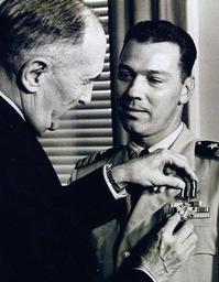 | Keywords: people indoor 330-PSA-230-60 (USN 710806): Speed Record Breaking Navy Pilot Receives Distinguished Flying Cross. Secretary of the Navy William B. Franke pins the Distinguished Flying Cross on Commander John F. Davis, USN, during a brief ceremony in the Pentagon, October 4, 1960. Commander Davis succeeded in establishing a world aircraft speed record, pending certification by the Federation Aeronautique Internationale, which betters a Russian claim for the same record made three months ago. The Navy’s record flight was made on September 25 in a McDonnell F4H-1 Phantom II fighter averaging 1390.21 miles an hour over a 100 kilometer closed circuit course 45,000 feet above the Mojave Desert. His plane banked in a near vertical altitude, Commander Davis sped around the exacting 62-mile circular course at Edwards Air Force Base, California, in two minutes, 40.9 seconds. The citation reads in part, “For extraordinary achievement in aerial flight on September 25, 1960, as pilot of a Navy All-Weather Fighter Aircraft, F4H-1, Phantom II, Commander John F. Davis, succeeded in establishing a new world record, and a world class record for class “c” jet aircraft on a 100 kilometer closed course. In the preparation for and execution of this flight, he exercised brilliant airmanship, initiative, foresight and planning ability beyond expectations of normal duty. Through his exceptional feat, he clearly demonstrated the inherent capabilities and the maximum performance of a most important aircraft of the U.S. Navy and focused world attention on the continued significant development of the science of aviation in the U.S. and the superiority of her aircraft and pilots, October 5, 1960. (9/9/2015). 330-PSA-230-60 (USN 710806): Speed Record Breaking Navy Pilot Receives Distinguished Flying Cross. Secretary of the Navy William B. Franke pins the Distinguished Flying Cross on Commander John F. Davis, USN, during a brief ceremony in the Pentagon, October 4, 1960. Commander Davis succeeded in establishing a world aircraft speed record, pending certification by the Federation Aeronautique Internationale, which betters a Russian claim for the same record made three months ago. The Navy’s record flight was made on September 25 in a McDonnell F4H-1 Phantom II fighter averaging 1390.21 miles an hour over a 100 kilometer closed circuit course 45,000 feet above the Mojave Desert. His plane banked in a near vertical altitude, Commander Davis sped around the exacting 62-mile circular course at Edwards Air Force Base, California, in two minutes, 40.9 seconds. The citation reads in part, “For extraordinary achievement in aerial flight on September 25, 1960, as pilot of a Navy All-Weather Fighter Aircraft, F4H-1, Phantom II, Commander John F. Davis, succeeded in establishing a new world record, and a world class record for class “c” jet aircraft on a 100 kilometer closed course. In the preparation for and execution of this flight, he exercised brilliant airmanship, initiative, foresight and planning ability beyond expectations of normal duty. Through his exceptional feat, he clearly demonstrated the inherent capabilities and the maximum performance of a most important aircraft of the U.S. Navy and focused world attention on the continued significant development of the science of aviation in the U.S. and the superiority of her aircraft and pilots, October 5, 1960. (9/9/2015). |