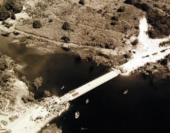 Keywords: outdoor 330-PSA-293-60 (USN 1051356): Bridge Built by U.S. Navy Seabees dedicated at Lake Miraogoane, Haiti. Aerial view of Dedication Ceremonies at Navy-built bridge, Miragoane, Haiti, November 22, 1960. Master Caption: Representatives of the Government of the United States and Haiti dedicated a U.S. Navy Seabee-built bridge that spans the flooded Lake Miraogoane near Mira, Haiti, November 22, 1960. Among the dignitaries attending were U.S. Ambassador to Haiti and the Haitian Minister of Public Works, Marcel Daumec. Haitian Army engineers called the U.S. for help last summer when an unusual rainfall caused the lake to rise and virtually isolate the southern tip of Haiti. The single highway access to the area was flooded and a result of the western side of the southern peninsula was isolated. A Seabee Detachment from Amphibious Construction Battalion Two (ACB-2), was rushed to the area with supplies to build a pontoon bridge across the flooded sections and improve six miles of road in the bridge approaches. The ACB-2 Unit encountered a two-acre floating island of debris blocking access channels to the bridge. The “Can Do” Seabees blasted the “islands” into sections and then used pontoons and propulsion unit to push the debris to the shoreline. Approval and funds for the project were provided by the International Cooperation Administration, though a cooperative arrangement with the Haitian Government, to the U.S. Navy Department. Photograph released December 2, 1960. (9/15/15). 330-PSA-293-60 (USN 1051356): Bridge Built by U.S. Navy Seabees dedicated at Lake Miraogoane, Haiti. Aerial view of Dedication Ceremonies at Navy-built bridge, Miragoane, Haiti, November 22, 1960. Master Caption: Representatives of the Government of the United States and Haiti dedicated a U.S. Navy Seabee-built bridge that spans the flooded Lake Miraogoane near Mira, Haiti, November 22, 1960. Among the dignitaries attending were U.S. Ambassador to Haiti and the Haitian Minister of Public Works, Marcel Daumec. Haitian Army engineers called the U.S. for help last summer when an unusual rainfall caused the lake to rise and virtually isolate the southern tip of Haiti. The single highway access to the area was flooded and a result of the western side of the southern peninsula was isolated. A Seabee Detachment from Amphibious Construction Battalion Two (ACB-2), was rushed to the area with supplies to build a pontoon bridge across the flooded sections and improve six miles of road in the bridge approaches. The ACB-2 Unit encountered a two-acre floating island of debris blocking access channels to the bridge. The “Can Do” Seabees blasted the “islands” into sections and then used pontoons and propulsion unit to push the debris to the shoreline. Approval and funds for the project were provided by the International Cooperation Administration, though a cooperative arrangement with the Haitian Government, to the U.S. Navy Department. Photograph released December 2, 1960. (9/15/15). |