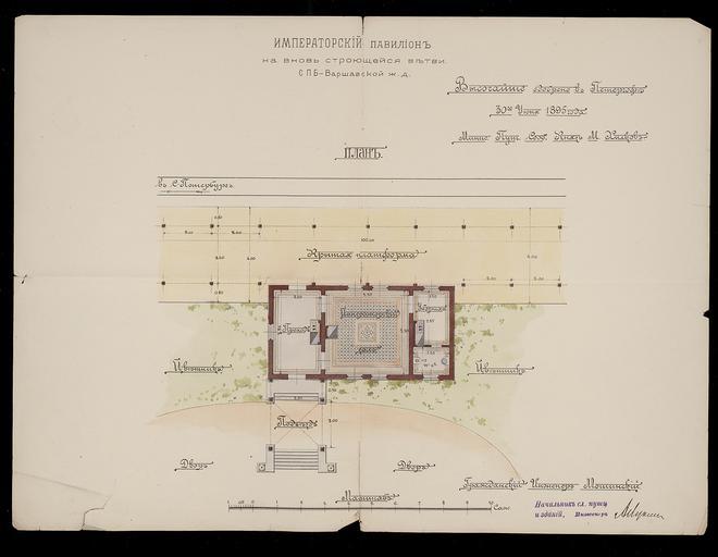 | Keywords: <b>Императорский павильон</b> на вновь строящейся ветви СПб-Варшавской ж. д. Высочайше одобрено в Петергофе 30 июня 1895 года <b>План</b> Источник: <i>РГИА Российской Федерации, фонд 350, опись 44, дело 773, лист 5.</i> russia railway россия вокзал tsarskoyeselo железнаядорога жд zarskojeselo исторический царскоесело чертёж пассажирскоездание петербурговаршавскаяжелезнаядорога ргиарф императорскийпавильон | ||||