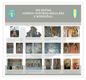 | Keywords: 350 vyrocie cerkvi.jpg sk Plagát k 350 výročiu cerkvi svätého Mikuláša v Bodružali Chrám sv Mikuláša bol postavený v roku 1658 a hoci bol niekoľkokrát opravovaný patrí medzi najstaršie a najlepšie zachované chrámy východného obradu na Slovensku Jeho 3-dielny zrub vymedzuje priestor vstupného podvežia lode a svätyne s rovným uzáverom Túto typickú dispozíciu už na prvý pohľad zdôrazňuje stupňovité zastrešenie s vežami stanového tvaru a drevenou šindľovou krytinou Bohatá maľovaná výzdoba z 18 storočia sa zachovala na severnej strane lode kde dominuje nástenná maľba Kalvárie Posledného súdu a Ukrižovania Ikonostas s niekoľkými staršími ikonami pochádza z roku 1794 own Peter Zelizňák 2009-03-06 Own work all rights released Public domain PD self Bodružal Educational and health posters Temple of St Nicholas Bodružal Posters in Svidník District Images by Peter Zeliznak |