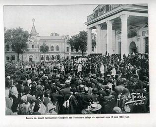 | Keywords: 39. Вынос мощей Преподобного Серафима из Успенского собора на крестный ход, 18 июля 1903 года.jpg ru Вынос мощей П еподобного Се афима из Успенского собо а на к естный ход 18 июля 1903 года 1904 http //andcvet narod ru/arxan/24/sam html не указано other versions Custom license marker 2014 09 24 PD-RusEmpire Uploaded with UploadWizard Album of the Sarov Hermitage views 1904 | ||||