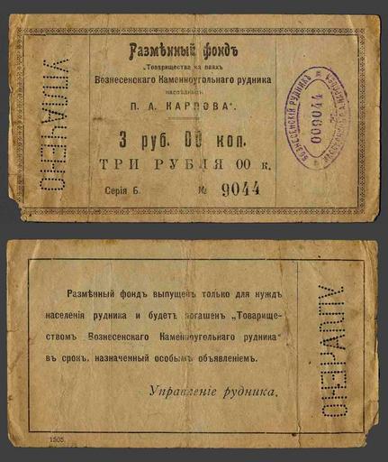 | Keywords: Вознесенский рудник. 3 рубля.jpg Юзовка Разменный денежный знак това ищества на паях Вознесенского каменноугольного удника наследниц П А Ка пова 3 убля http //forum gp dn ua/viewtopic php f 28 t 952 sid a2c8198a8c0277c6542008ec0ed5a590 Выпуск собственных бон нужно видимо отнести к началу 1918 года Author PD-RusEmpire Money of Donetsk Moneys uploaded by Andrew Butko from various sources Donetsk in the unidentified decade Historical non-photos images of Donetsk by alphabet Images from forum gp dn ua Banknotes with a face value of 3 |