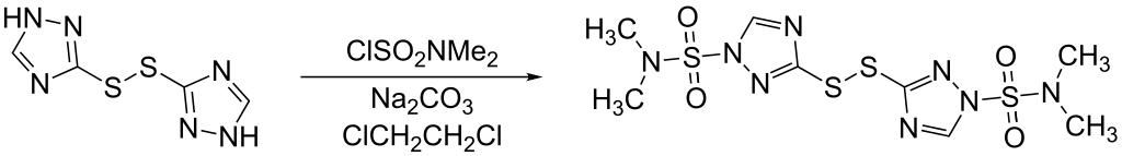 | Keywords: 3,3'-disulfanediylbis(N,N-dimethyl-1H-1,2,4-triazole-1-sulfonamide) synthesis.svg validSVG Synthesis of 3 3'-disulfanediylbis N N-dimethyl-1H-1 2 4-triazole-1-sulfonamide Own 2014-03-06 Emeldir <span class signature-talk >talk</span> PD-chem Fungicide syntheses |