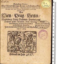 | Keywords: 3-626189D 001 X.jpg Zeitung mit Nachrichten aus dem Juni 1627 insebsondere über den Dreißigjährigen Krieg Transkription s de Warhafftiger Bericht Was sich mit Königl Mayt bey Havelberg und dem General Wallensteiner begeben und zugetragen hat University Library Halle 1627 Author Author died more than 70 years ago - public domain PD-old-100 De Wikisource book leaflet 1627 books Albrecht von Waldstein Illustrated title pages from Germany | ||||