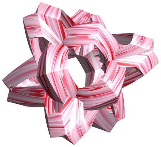 Keywords: mathematica 3d cg parametricplot3d texture torus 輪環 りんかん ドーナツ どーなつ 六芒星 ろくぼうせい 六光星 ろくこうせい 六稜星 ろくりょうせい program プログラム code コード algorithm コード アルゴリズム hexagram geometric sculpture geometricsculpture shape geometry sculpture mapping テクスチャ マッピング 模様 もよう design pattern デザイン パターン graphic グラフィック グラフィクス structure 意匠 構造 symmetry 対称性 たいしょうせい シンメトリー 対称 たいしょう algorithm white background indoor SetOptions[ParametricPlot3D, PlotRange -> Full, Mesh -> None, Boxed -> False, Axes -> None, PlotPoints -> 300, ImageSize -> 3000, PlotStyle -> Directive[Specularity[White, 30], Texture[Import["D:/tmp/86.jpg"]]], TextureCoordinateFunction -> ({#4 + #5, #5/Pi} &), Lighting -> "Neutral"]; a = 4; (* center hole size of a torus *) b = 6; (* hexa-torus *) d = 3; (* number of torus *) f[v_] := TriangleWave[{-1, 1}, v]; g[v_] := TriangleWave[{-1, 1}, v + 1/4]; x = (a - g[t] - f[b s]) g[s]; y = f[t]; z = (a - g[t] - f[b s]) f[s]; rot = Table[{x, y, z}.RotationMatrix[2 i Pi /d, {1, 1, 1}], {i, d}]; ParametricPlot3D[rot, {t, 0, 1}, {s, 0, 1}] (* --- The Texture *) SetOptions[ParametricPlot3D, PlotRange -> Full, Mesh -> None, Boxed -> False, Axes -> None, PlotPoints -> 300, ImageSize -> 3000, PlotStyle -> Directive[Specularity[White, 30], Texture[Import["D:/tmp/86.jpg"]]], TextureCoordinateFunction -> ({#4 + #5, #5/Pi} &), Lighting -> "Neutral"]; a = 4; (* center hole size of a torus *) b = 6; (* hexa-torus *) d = 3; (* number of torus *) f[v_] := TriangleWave[{-1, 1}, v]; g[v_] := TriangleWave[{-1, 1}, v + 1/4]; x = (a - g[t] - f[b s]) g[s]; y = f[t]; z = (a - g[t] - f[b s]) f[s]; rot = Table[{x, y, z}.RotationMatrix[2 i Pi /d, {1, 1, 1}], {i, d}]; ParametricPlot3D[rot, {t, 0, 1}, {s, 0, 1}] (* --- The Texture *) |