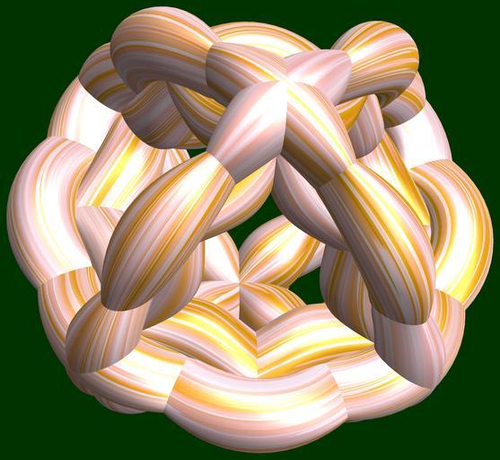 Keywords: mathematica 3d cg parametricplot3d texture torus 輪環 りんかん ドーナツ どーなつ 八芒星 はちぼうせい 八光星 はちこうせい 八稜星 はちりょうせい program プログラム code コード algorithm コード アルゴリズム geometric sculpture geometricsculpture shape geometry sculpture mapping テクスチャ マッピング 模様 もよう abstract 抽象 ちゅうしょう アブストラクト design pattern デザイン パターン graphic グラフィック グラフィクス structure 意匠 構造 symmetry 対称性 たいしょうせい シンメトリー 対称 たいしょう algorithm black background photo border SetOptions[ParametricPlot3D, PlotRange -> Full, Mesh -> None, Boxed -> False, Axes -> None, PlotPoints -> 400, ImageSize -> 3000, Background -> Darker[Green, 0.8], PlotStyle -> Directive[Specularity[White, 30], Texture[Import["D:/tmp/861.jpg"]]], TextureCoordinateFunction -> ({#4 + #5, #5/Pi} &), Lighting -> "Neutral"]; a = 5; (* center hole size of a torus *) b = 8; (* octa-torus *) d = 3; (* number of torus *) v = 3; x = (a - Cos[t] - Sin[b s]) Cos[v (s + Pi/(2 b))]; y = Sin[t] Sin[b s]; z = (a - Cos[t] - Sin[b s]) Sin[v (s + Pi/(2 b))]; rot = Table[{x, y, z}.RotationMatrix[2 i Pi/d, {1, 1, 1}], {i, d}]; ParametricPlot3D[rot, {t, 0, 2 Pi}, {s, 0, 2 Pi}] (*--- The Texture *) SetOptions[ParametricPlot3D, PlotRange -> Full, Mesh -> None, Boxed -> False, Axes -> None, PlotPoints -> 400, ImageSize -> 3000, Background -> Darker[Green, 0.8], PlotStyle -> Directive[Specularity[White, 30], Texture[Import["D:/tmp/861.jpg"]]], TextureCoordinateFunction -> ({#4 + #5, #5/Pi} &), Lighting -> "Neutral"]; a = 5; (* center hole size of a torus *) b = 8; (* octa-torus *) d = 3; (* number of torus *) v = 3; x = (a - Cos[t] - Sin[b s]) Cos[v (s + Pi/(2 b))]; y = Sin[t] Sin[b s]; z = (a - Cos[t] - Sin[b s]) Sin[v (s + Pi/(2 b))]; rot = Table[{x, y, z}.RotationMatrix[2 i Pi/d, {1, 1, 1}], {i, d}]; ParametricPlot3D[rot, {t, 0, 2 Pi}, {s, 0, 2 Pi}] (*--- The Texture *) |