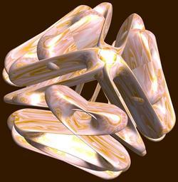 | Keywords: mathematica 3d cg parametricplot3d texture torus 輪環 りんかん ドーナツ どーなつ 八芒星 はちぼうせい 八光星 はちこうせい 八稜星 はちりょうせい code program algorithm コード プログラム アルゴリズム geometric sculpture geometricsculpture shape geometry sculpture mapping テクスチャ マッピング 模様 もよう abstract 抽象 ちゅうしょう アブストラクト design pattern デザイン パターン graphic グラフィック グラフィクス structure 意匠 構造 symmetry 対称性 たいしょうせい シンメトリー 対称 たいしょう algorithm コード black background surreal food a = 3; (* center hole size of a torus *) b = 8; (* octa-torus *) c = -5; (* distance from the center of rotation *) d = 3; (* number of torus *) h = 2; (* height of a torus *) SetOptions[ParametricPlot3D, PlotRange -> Full, Mesh -> None, Boxed -> False, Axes -> False, PlotPoints -> 400, ImageSize -> 3000, Background -> Darker[Orange, 0.8], PlotStyle -> Directive[Specularity[White, 30], Texture[Import["D:/tmp/861.jpg"]]], TextureCoordinateFunction -> ({#4, #5 2 Pi} &), Lighting -> "Neutral"]; f[v_] := Sin[2 Sin[Sin[Sin[v]]]]; x = (a - Cos[t] - f[b s]) Cos[s + Pi/(2 b)]; y = (a - Cos[t] - f[b s]) Sin[s + Pi/(2 b)]; z = (a - Sin[t] - h f[b s]) + c; rm = Table[{x, y, z}.RotationMatrix[2 i Pi/d, {1, 0, 0}], {i, d}]; ParametricPlot3D[rm, {t, 0, 2 Pi}, {s, 0, 2 Pi}] (*--- The Texture *) a = 3; (* center hole size of a torus *) b = 8; (* octa-torus *) c = -5; (* distance from the center of rotation *) d = 3; (* number of torus *) h = 2; (* height of a torus *) SetOptions[ParametricPlot3D, PlotRange -> Full, Mesh -> None, Boxed -> False, Axes -> False, PlotPoints -> 400, ImageSize -> 3000, Background -> Darker[Orange, 0.8], PlotStyle -> Directive[Specularity[White, 30], Texture[Import["D:/tmp/861.jpg"]]], TextureCoordinateFunction -> ({#4, #5 2 Pi} &), Lighting -> "Neutral"]; f[v_] := Sin[2 Sin[Sin[Sin[v]]]]; x = (a - Cos[t] - f[b s]) Cos[s + Pi/(2 b)]; y = (a - Cos[t] - f[b s]) Sin[s + Pi/(2 b)]; z = (a - Sin[t] - h f[b s]) + c; rm = Table[{x, y, z}.RotationMatrix[2 i Pi/d, {1, 0, 0}], {i, d}]; ParametricPlot3D[rm, {t, 0, 2 Pi}, {s, 0, 2 Pi}] (*--- The Texture *) |