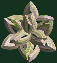 | Keywords: mathematica 3d cg parametricplot3d texture torus code program algorithm プログラム コード アルゴリズム 輪環 りんかん ドーナツ どーなつ 五芒星 ごぼうせい geometric sculpture geometricsculpture shape geometry sculpture mapping テクスチャ マッピング 模様 もよう abstract 抽象 ちゅうしょう アブストラクト design pattern デザイン パターン graphic グラフィック グラフィクス structure 意匠 構造 symmetry 対称性 たいしょうせい シンメトリー 対称 たいしょう pastel a = 3; (* center hole size *) b = 5; (* penta-torus *) c = 1; (* distance from the center of rotation *) d = 3; (* number of torus *) h = 2; (* height of a torus *) SetOptions[ParametricPlot3D, PlotRange -> Full, Mesh -> None, Boxed -> False, Axes -> False, PlotPoints -> 400, ImageSize -> 3000, Background -> RGBColor[{20, 50, 30}/255], PlotStyle -> Directive[Specularity[White, 70], Texture[Import["D:/tmp/862.jpg"]]], TextureCoordinateFunction -> ({#4 + #5, #5 / Pi} &), Lighting -> "Neutral"]; f[v_] := TriangleWave[{-1, 1}, v/(2 Pi)]; g[v_] := TriangleWave[{-1, 1}, v/(2 Pi) + 1/4]; x = (a - g[t] - f[b s]) Cos[s] + c; y = (a - g[t] - f[b s]) Sin[s] + c; z = (a - f[t] - h f[b s]); rm = Table[{x, y, z}.RotationMatrix[2 i Pi/d, {0, 0, 1}], {i, d}]; ParametricPlot3D[rm, {t, 0, 2 Pi}, {s, 0, Pi}] (*--- The Texture *) a = 3; (* center hole size *) b = 5; (* penta-torus *) c = 1; (* distance from the center of rotation *) d = 3; (* number of torus *) h = 2; (* height of a torus *) SetOptions[ParametricPlot3D, PlotRange -> Full, Mesh -> None, Boxed -> False, Axes -> False, PlotPoints -> 400, ImageSize -> 3000, Background -> RGBColor[{20, 50, 30}/255], PlotStyle -> Directive[Specularity[White, 70], Texture[Import["D:/tmp/862.jpg"]]], TextureCoordinateFunction -> ({#4 + #5, #5 / Pi} &), Lighting -> "Neutral"]; f[v_] := TriangleWave[{-1, 1}, v/(2 Pi)]; g[v_] := TriangleWave[{-1, 1}, v/(2 Pi) + 1/4]; x = (a - g[t] - f[b s]) Cos[s] + c; y = (a - g[t] - f[b s]) Sin[s] + c; z = (a - f[t] - h f[b s]); rm = Table[{x, y, z}.RotationMatrix[2 i Pi/d, {0, 0, 1}], {i, d}]; ParametricPlot3D[rm, {t, 0, 2 Pi}, {s, 0, Pi}] (*--- The Texture *) |
