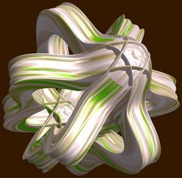 | Keywords: mathematica 3d cg parametricplot3d texture torus 輪環 りんかん ドーナツ どーなつ 五芒星 ごぼうせい 五光星 ごこうせい 五稜星 ごりょうせい program プログラム code コード algorithm コード アルゴリズム pentagram geometric sculpture geometricsculpture shape geometry sculpture mapping テクスチャ マッピング 模様 もよう design pattern デザイン パターン graphic グラフィック グラフィクス structure 意匠 構造 symmetry 対称性 たいしょうせい シンメトリー 対称 たいしょう algorithm black background pastel indoor surreal SetOptions[ParametricPlot3D, PlotRange -> Full, Mesh -> None, Boxed -> False, Axes -> None, PlotPoints -> 400, ImageSize -> 3000, Background -> Darker[Orange, 0.8], PlotStyle -> Directive[Specularity[White, 30], Texture[Import["D:/tmp/862.jpg"]]], TextureCoordinateFunction -> ({#4 + #5, #5/Pi} &), Lighting -> "Neutral"]; a = 5; (* center hole size of a torus *) b = 5; (* penta-torus *) c = 0; (* distance from the center of rotation *) d = 3; (* number of torus *) g[v_] := Sum[(-1)^(k + 1) Cos[(2 k - 1) v]/(2 k - 1), {k, 4}]; x = (a - g[t] - Sin[b s]) Cos[s + Pi/(2 b)] + c; y = Sin[t] + c; z = (a - g[t] - Sin[b s]) Sin[s + Pi/(2 b)] + c; rot = Table[{x, y, z}.RotationMatrix[2 i Pi/d, {1, 0, 0}], {i, d}]; ParametricPlot3D[rot, {t, 0, 2 Pi}, {s, 0, 2 Pi}] (*--- The Texture The g[] is a 4-partial sum of the Fourier series for Square wave. g[]は矩形波のフーリエ展開の最初の4項 *) SetOptions[ParametricPlot3D, PlotRange -> Full, Mesh -> None, Boxed -> False, Axes -> None, PlotPoints -> 400, ImageSize -> 3000, Background -> Darker[Orange, 0.8], PlotStyle -> Directive[Specularity[White, 30], Texture[Import["D:/tmp/862.jpg"]]], TextureCoordinateFunction -> ({#4 + #5, #5/Pi} &), Lighting -> "Neutral"]; a = 5; (* center hole size of a torus *) b = 5; (* penta-torus *) c = 0; (* distance from the center of rotation *) d = 3; (* number of torus *) g[v_] := Sum[(-1)^(k + 1) Cos[(2 k - 1) v]/(2 k - 1), {k, 4}]; x = (a - g[t] - Sin[b s]) Cos[s + Pi/(2 b)] + c; y = Sin[t] + c; z = (a - g[t] - Sin[b s]) Sin[s + Pi/(2 b)] + c; rot = Table[{x, y, z}.RotationMatrix[2 i Pi/d, {1, 0, 0}], {i, d}]; ParametricPlot3D[rot, {t, 0, 2 Pi}, {s, 0, 2 Pi}] (*--- The Texture The g[] is a 4-partial sum of the Fourier series for Square wave. g[]は矩形波のフーリエ展開の最初の4項 *) |